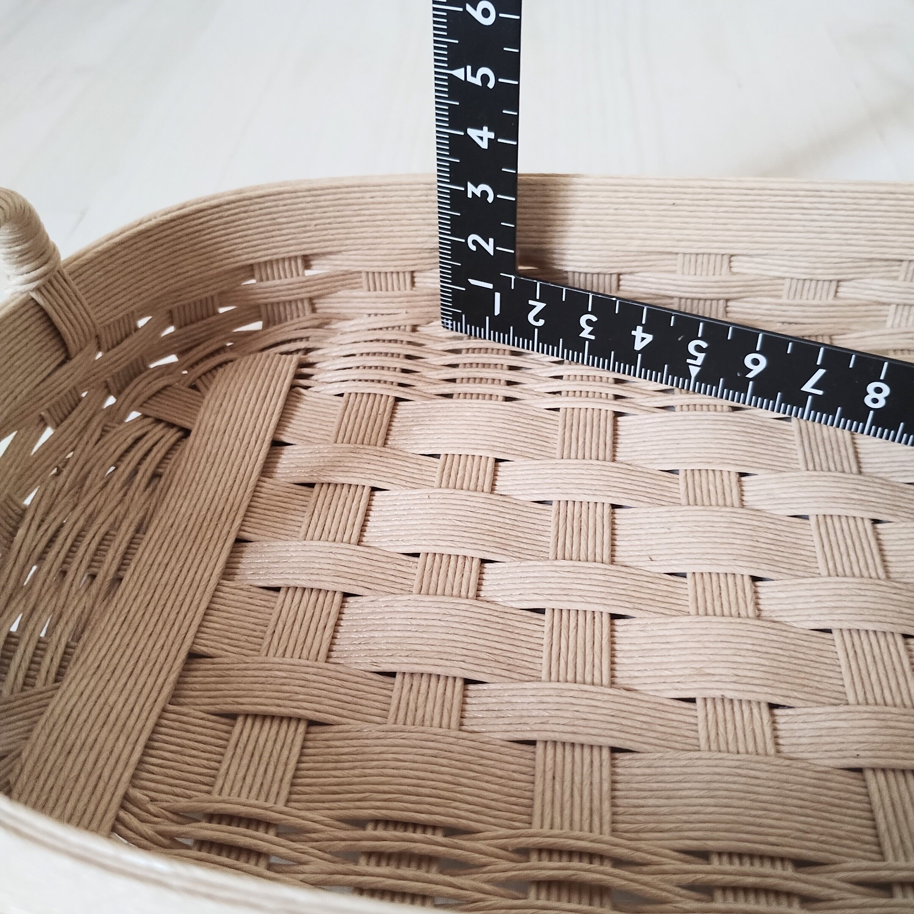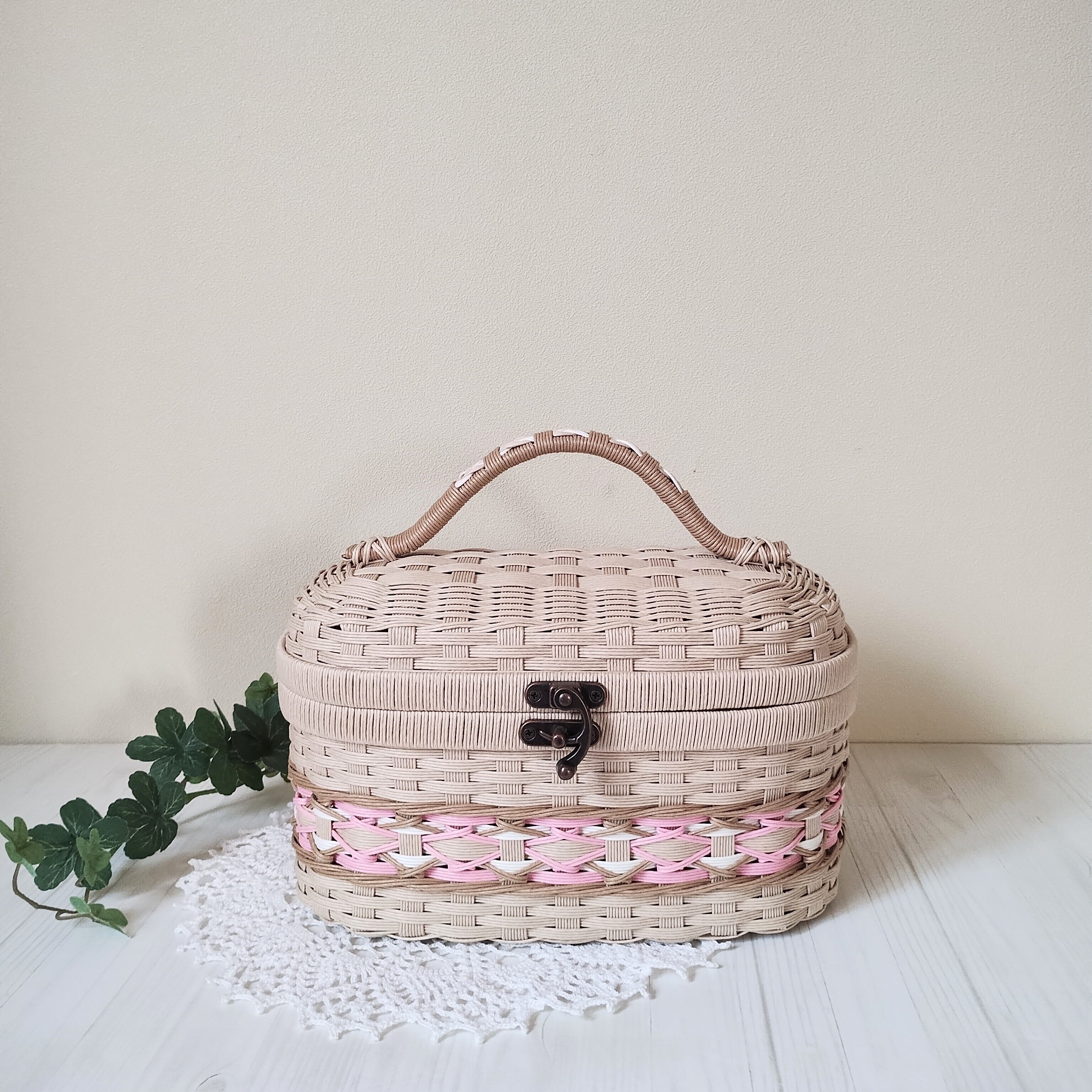 フタ付きバスケット(まる) 中トレー付き ベージュ×ピンク 紙バンド クラフトバンド